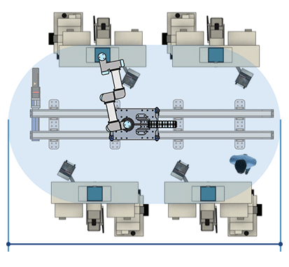 Includes: Dual linear units, Kollmorgen servo motor, precision gearhead, carriage mounting plate for robot, Freedrive paddles, end-of-stroke limit switches, cable management, control box and software with 7th axis collision detection. For Universal Robots, a URCap is available for programming directly on the UR Teach Pendant.